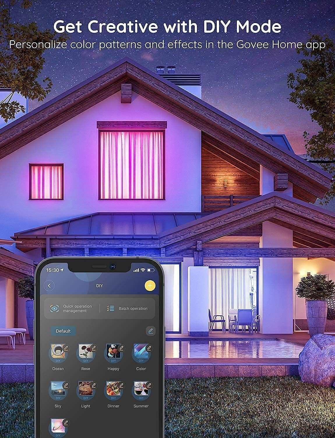 Creative Customization: The DIY mode in the Govee Home app allows you to personalize lighting effects. Choose from 16 million colors and different styles to reinvent your bedroom, kitchen, home decorations for the home with LED lighting strips.