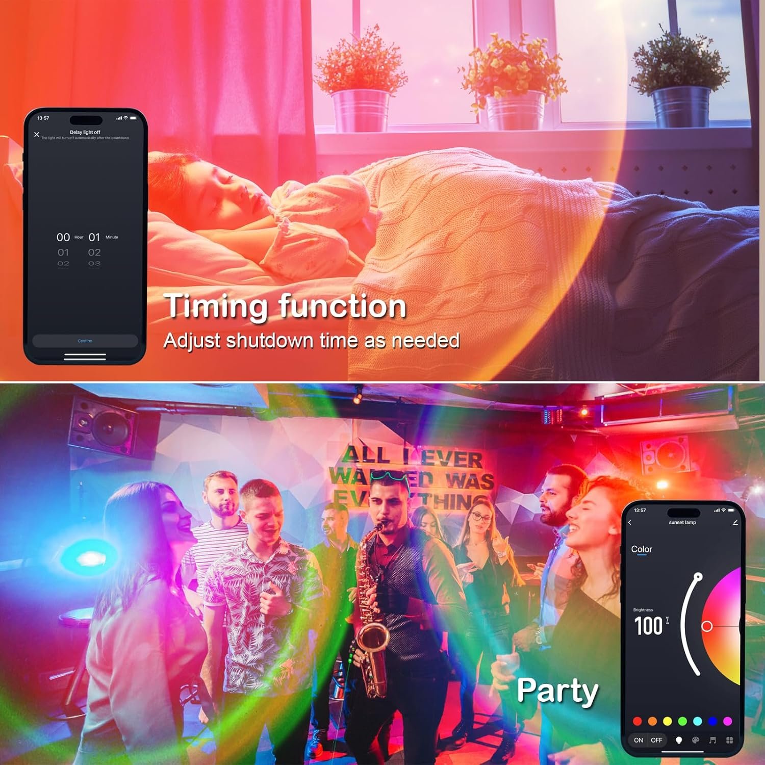 【APP& Remote Control 】Choose from over 21 colors and 4 dynamic modes via a switch button or the app, meeting the different lighting needs of users in various scenes. Adjusting the sunset projector lamp through the app for access to advanced modes such as unlimited RGB color options, dynamic modes, music, microphone, and timer modes, etc. Make your party atmosphere more exciting!
