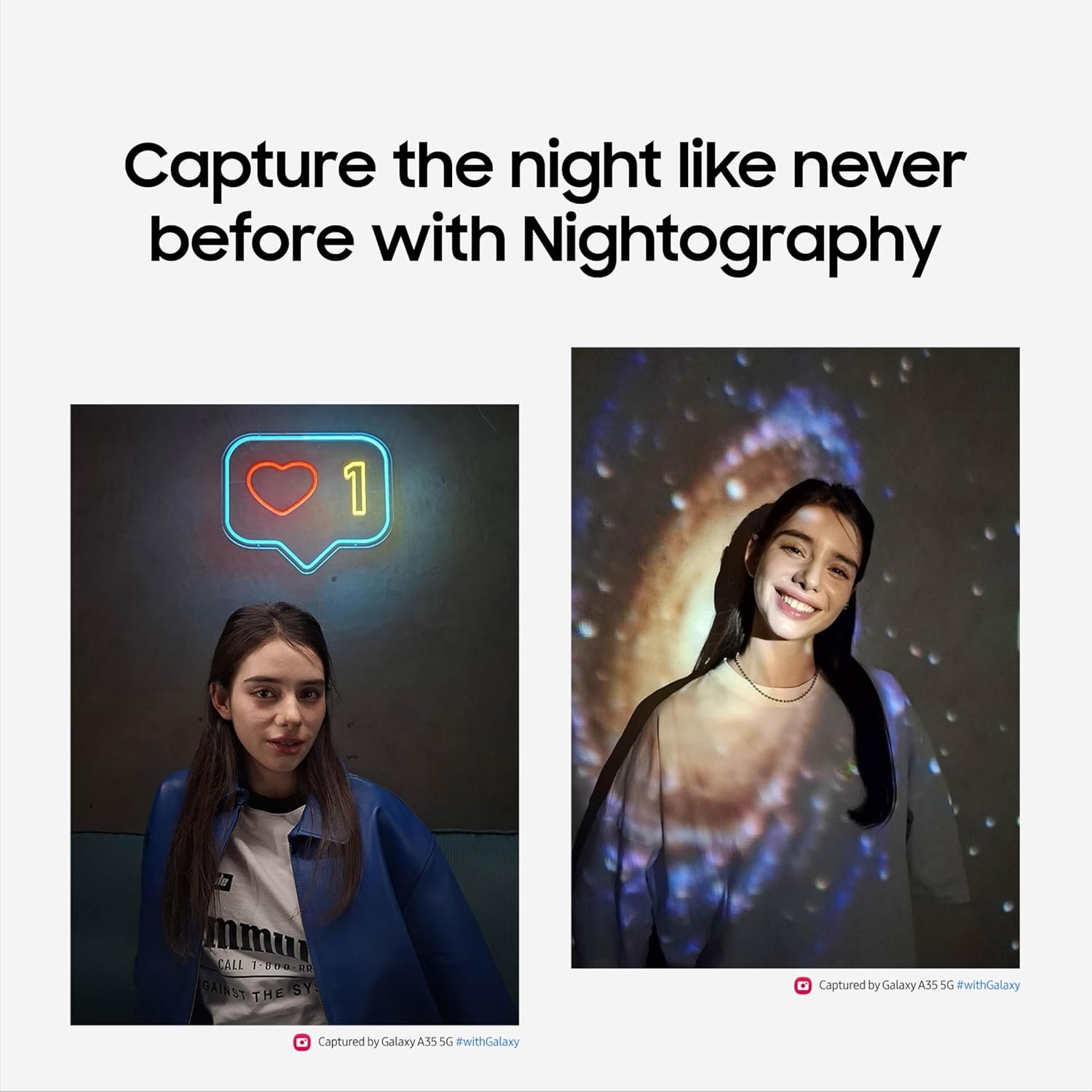 CAPTURE THE NIGHT LIKE NEVER BEFORE: Your nights just became a whole lot brighter with Galaxy A35 5G; Whether it’s fireworks, birthday candles or smiles under the stars, low-light photos and videos look clear as day with stunning Nightography